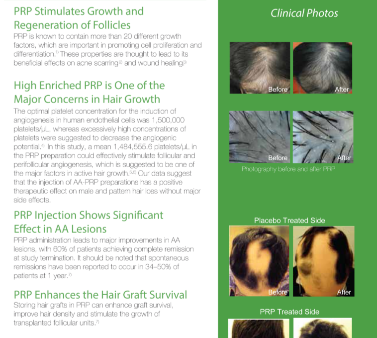Hair loss: Doctors have injected PRP into the scalp to promote hair growth and prevent hair loss. According to research from 2014, PRP injections are effective in treating androgenic alopecia, which is also known as male pattern baldness.