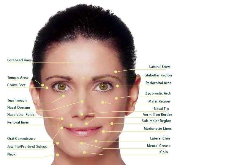 7,Oral Commissure 8,Jawline/Pre-Jowl Sulcus 9,Neck Wrinkle Treatment 10,Lateral Brow 11,GlabellarRegion 12,Periorbital Area 13,Zygomatic Arch 14,Malar Region 15,Nasal Tip 16,Vermillion Border 17,Sub-malar Region 18,Marionette Lines 19,Lateral Chin 20,Mental Crease