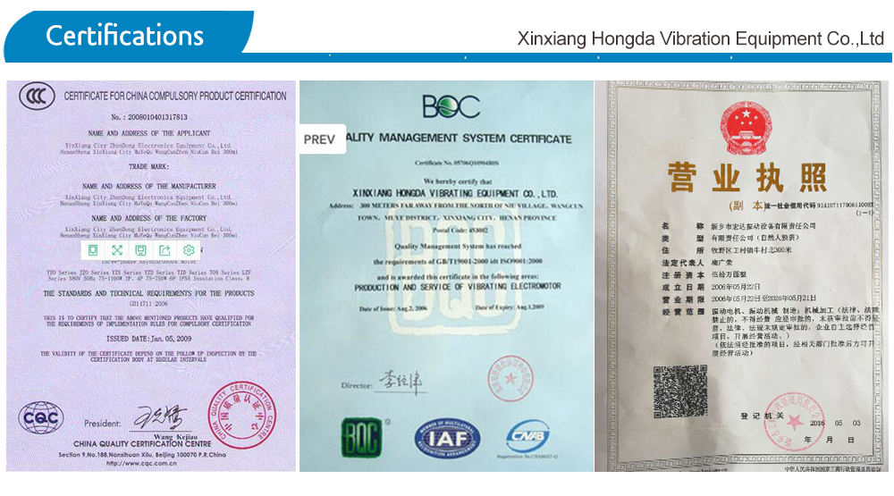 Xinxiang Hongda Vibration Equipment Co., Ltd. is a professional manufacturer for production, sales, research and development.We has been in these industries for 32 years.We got the ISO9001 certification in 2006,CCC certification in 2008.We are one of the biggest manufacture base of vibrating motor in Xinxiang city.20,000 sets vibration motor were sold last year.Because of our good quality and delivery on time.