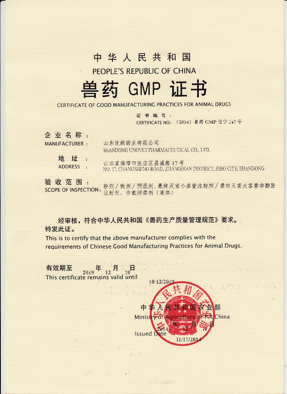 Unovet is a wholly owned Sino-Foreign company, who has devoted to animal health and veterinary pharmaceuticals industries for 20years. Unovet is a G.M.P certificated manufacturer for animal drugs and approved by the Ministry of Agriculture of P.R. C, certificated No. (2009) GMP 223 .