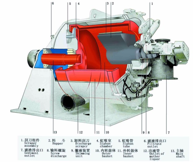 GKH horizontal scraper discharging centrifugal separator is a fully automatic-controling, continuous running, intermittent discharging filter type centrifugal separator. It can finish recoiling, feeding, dewatering, washing, discharging and unloading at full speed or variable speed. It is suitable for separating particles ranging 5um-5mm, DS1%-40% crystal or short-fiber material, especailly for large load production and sufficient washing