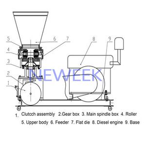 Poultry animal feed granulator adopts double-stage driving of belt and worm and gear. It has reliable operation and low noise.The feeding relies on the gravity of the material itself, which can avoid jams. The rotation speed of the main shaft is about 60 RPM, the linear speed of the roller is about 2.5 m/s, which can effectively removes the gas in the material and increases the tensity of the products.