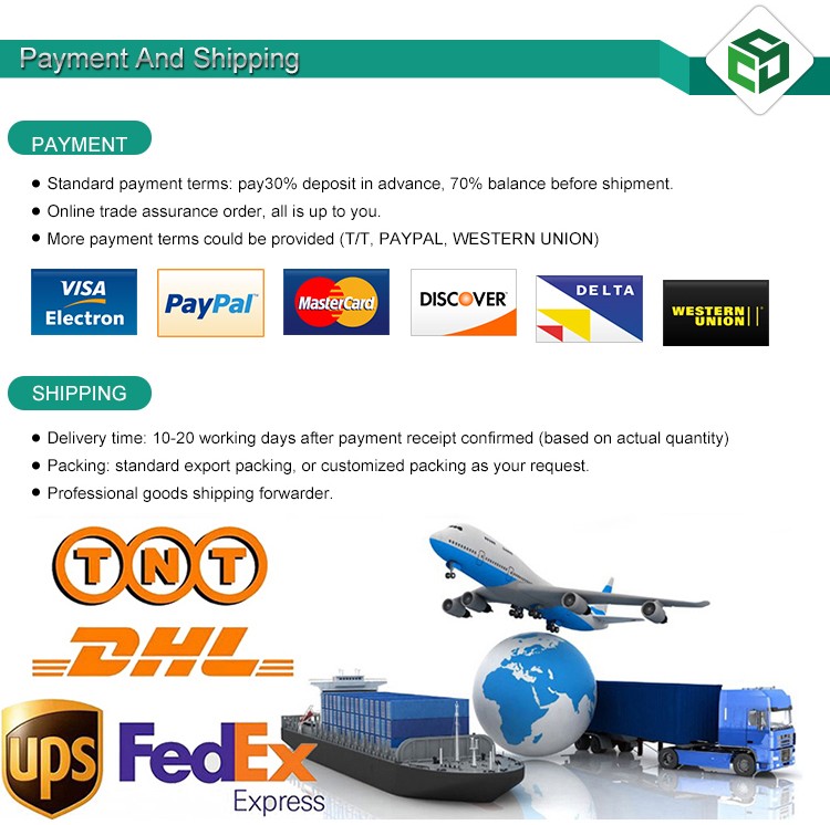 A: 30% T/T deposit and 70% T/T balance payment before shipping.