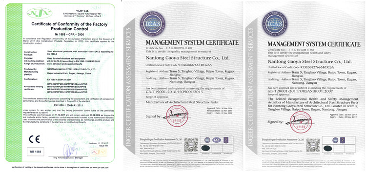 Nantong Gaoya Steel Structure Co. Ltd. (GAOYA) specilizes in Designing, Modeli ng, Manufacturing and InstalIi ng Pre—Engineered BuiIding (PEB) and Steel Structures in China. GAOYA is establ ished with the aim of providing Durable and AffordableEnergy Efficient BuiIding Solutions, with the focus on achieving high CustomerSatisfaction,GAOYA i s the brain chiId of a group of visionaries who have proven their abiIity and business acumen to identify opportunities both locally and globally over the span of 23 years. GAOYA is committed to meet customer requirement through our policy of zero compromise on quality and unfettered dedication of our employees. Our product depicts our specialization in steel & buiIding products that are applicable to heavy/medium industr ies , retail & logistics, automobiIe, general engineering warehouse, airplane hangars, commercial / highrise buil dings and leisure structures.