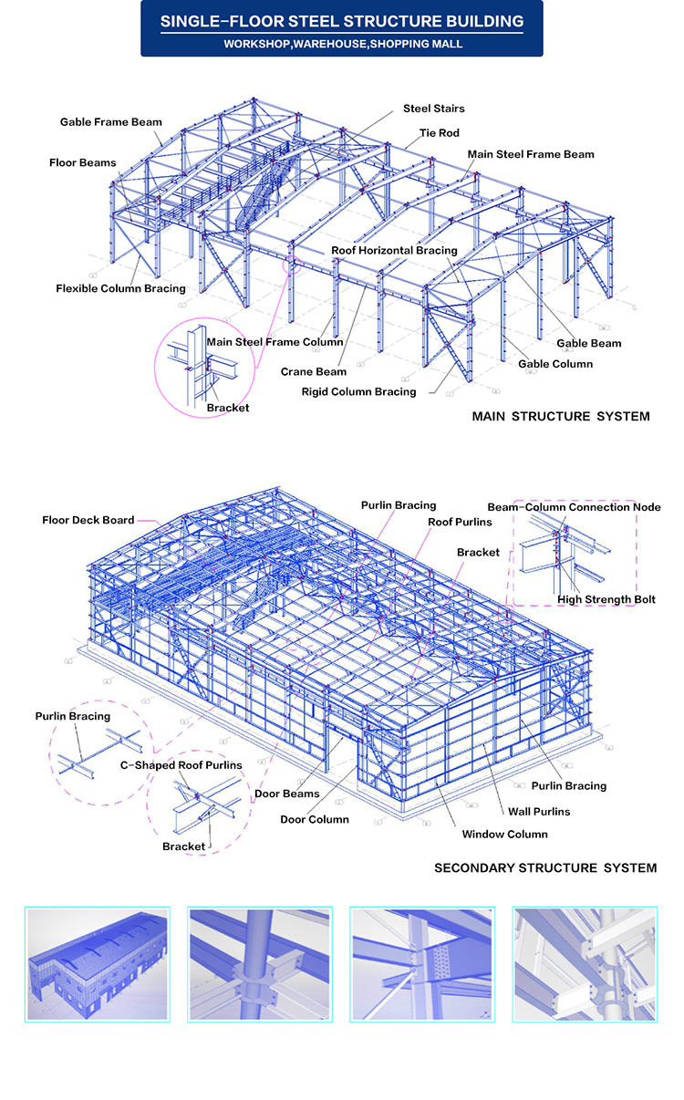 | Wall | 0.45/0.5/0.6mm corrugate steel sheet (Aluminum & Zinc coated AZ100g/m2+surface painting 20/5um) 50/75/100mm EPS, Rock wool, PU, Glass wool sandwich panel | |