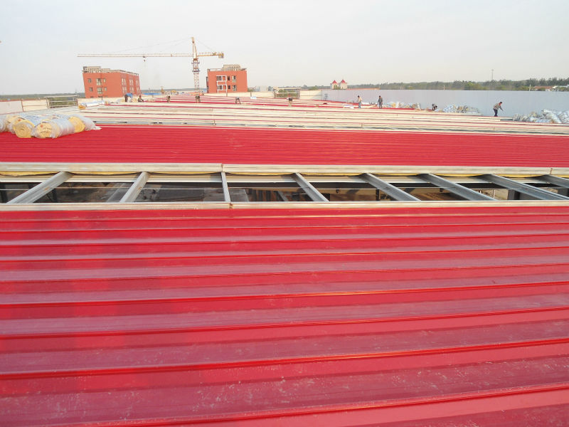 7) Different roof and wall panel: Sing colorful corrugated steel sheet (150mm wide) or sandwich panel with EPS , Rock wool , PU etc. Thickness of insulation material is around 50mm-100mm.