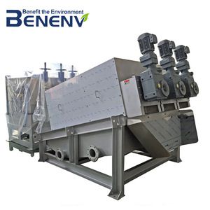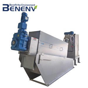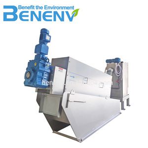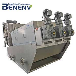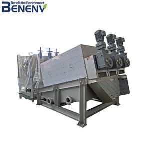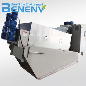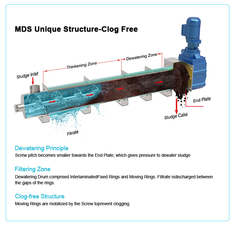 Multi-Disk Screw Press( Hereinafter referred as MDS ) belongs to the screw press, it's clog-free and can reduce the sedimentation tank and sludge thickening tank, saving the cost of sewage plant construction. MDS using screw and the moving rings to clean itself as clog-free structure, and controlled by the PLC automatically, it's a new technology that can replace the traditional filter press like belt press and frame press, the screw speed is very low, so it cost low power and water consumption in contrast to the centrifuge, it is a cutting edge sludge dewatering machine.