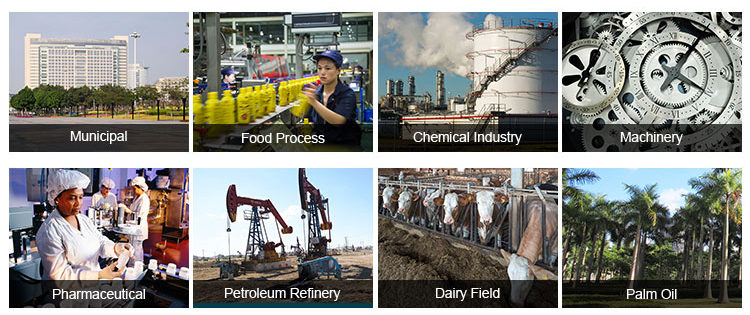 A: It is widely applied in Municipal water and wastewater treatment plants, Agricultural/fishery community wastewater treatment plants, Industrial waste treatment plants, Food/beverage production plants, Dairy farming/Meat processing plants, Chemicals manufacturing plants, Machinery manufacturing/Metal processing plants, Paper manufacturing, building material manufacturing, oilfield associated water accompanied with crude oil mining, etc..