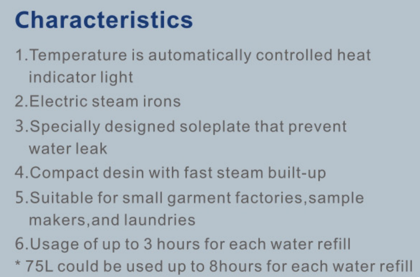 | MODEL | VOLTAGE | BOILER WATTAGE | IRON WATTAGE | STEAM PRESSURE | BOILER CAPACITY | USAGE TIME |