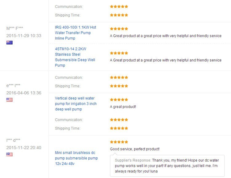 We got the positive feedback from the customer who ever bought our pumps, even if we got negative feedback we will help customers solve it on time.