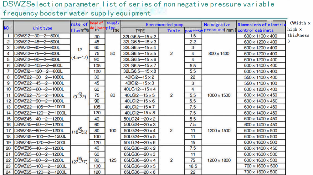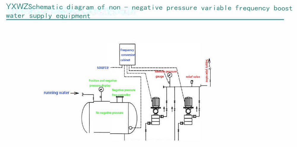 YXWZ-12-45-2-BOOL means no negative pressure water supply equipment, rated flow rate 12 m3 / h, rated head 45 m, two LG working pumps, no negative pressure device diameter 800 mm.