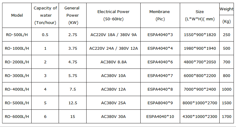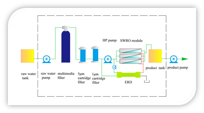Source tank →Feed water pump→ muti-media filter(sands filter)→ active carbon filter→ water softener(or inhibitor dosing)→Cartridge/Security/Micro filter→high-pressure/Centrifugal pump→ Reverse Osmosis system→ RO purified tank →ultraviolet sterilizer.