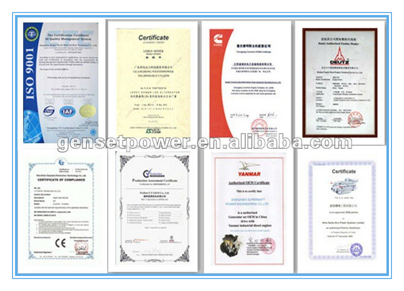 All Models are tested with 25degree centigrade air inlet temperature,150m(500ft),A.S.L 60% relative humidity.The genset coincident to the standard of GB2820,GB1105,ISO8528,ISO3046,IEC60034,SAEJ1394,BS5000,NEMA MG-1/22,DIN6271,DIN6280,VDE0530 and ISO9001,ISO14001