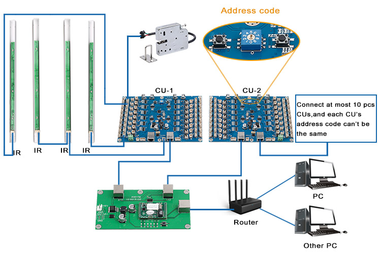 IR: Infrared sensor(optional). Connect to CU. Detecting locker condition(empty or occupied) and feedback to CU. Supply light when locker is open.