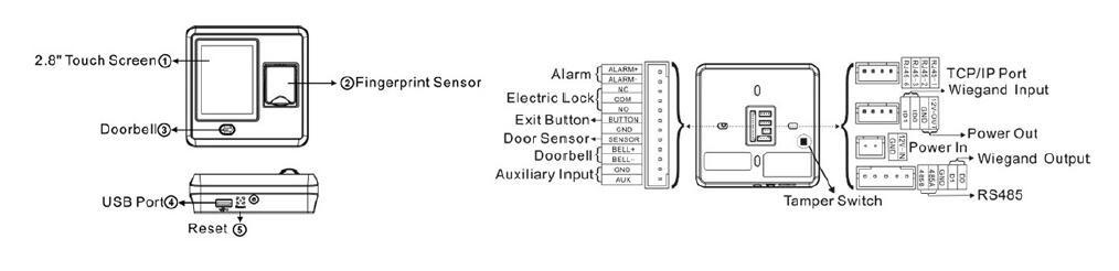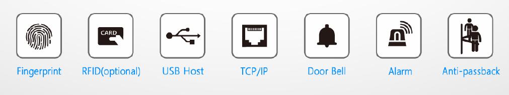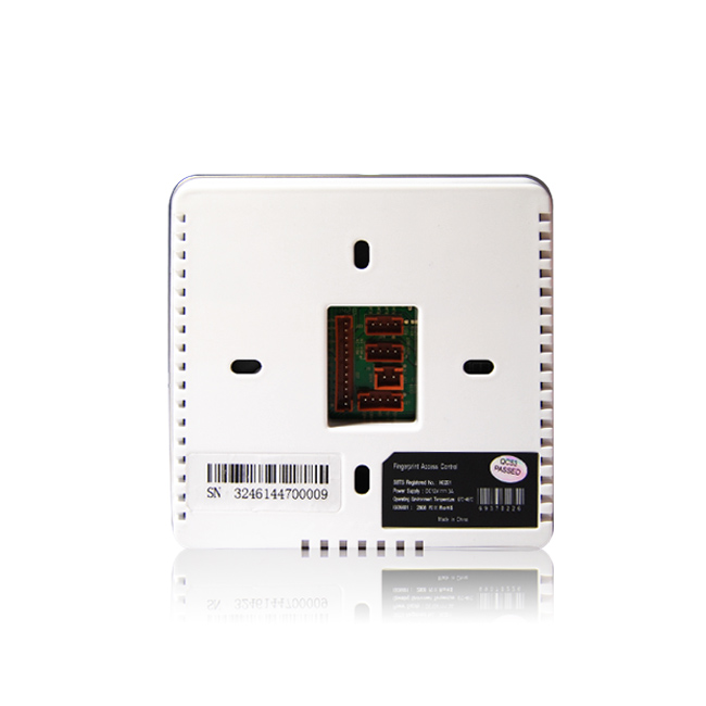 Function support | Built-in relay, Interface with alarm, Door sensor, Exit button and door lock for access control, 50 timezones, 10 combination, 99 groups, auto state, Schedule bell, Door bell, Holiday control, 9 PIN User ID |