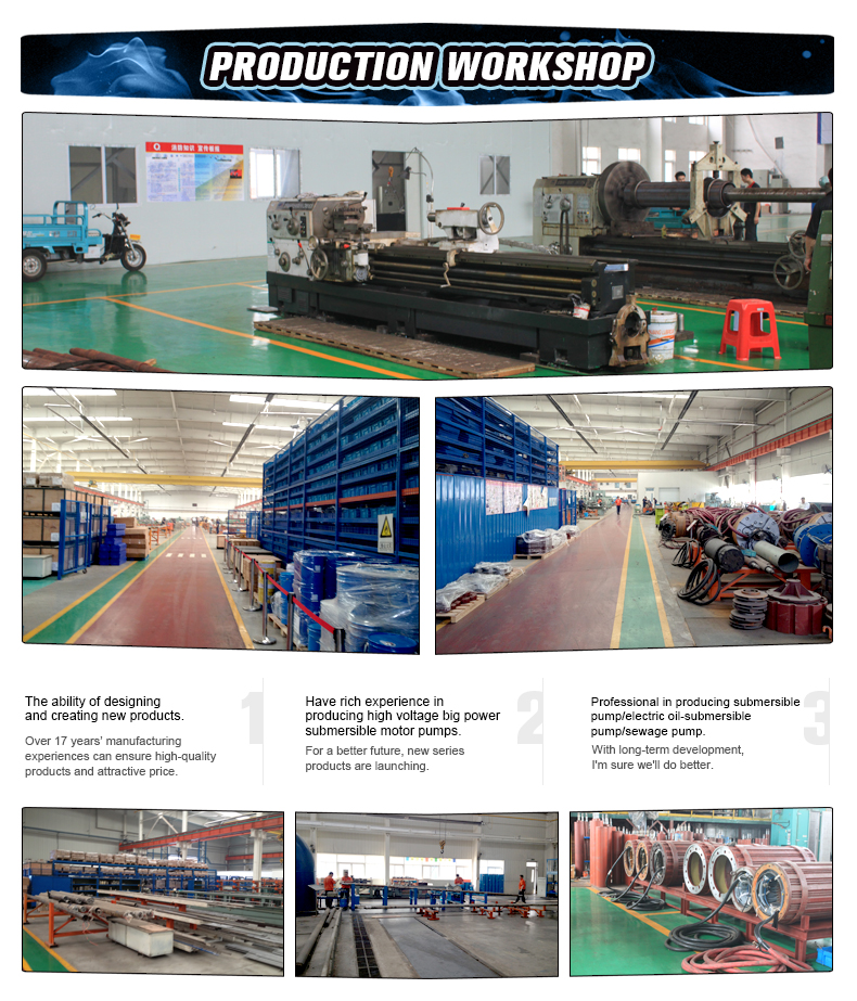 Main products: Submersible motor pumps, stainless steel submersible borehole pumps, sea water pumps, deep well submersible pumps, electric submersible oil pumps, sewage pumps, ZPQK/SXQK single suction and double suction mining submersible motor pumps, QZB/QHB axial flow pumps, mixed flow pumps,LX screw centrifugal pump and High voltage and low voltage 3 phase submersible Ac motor.
