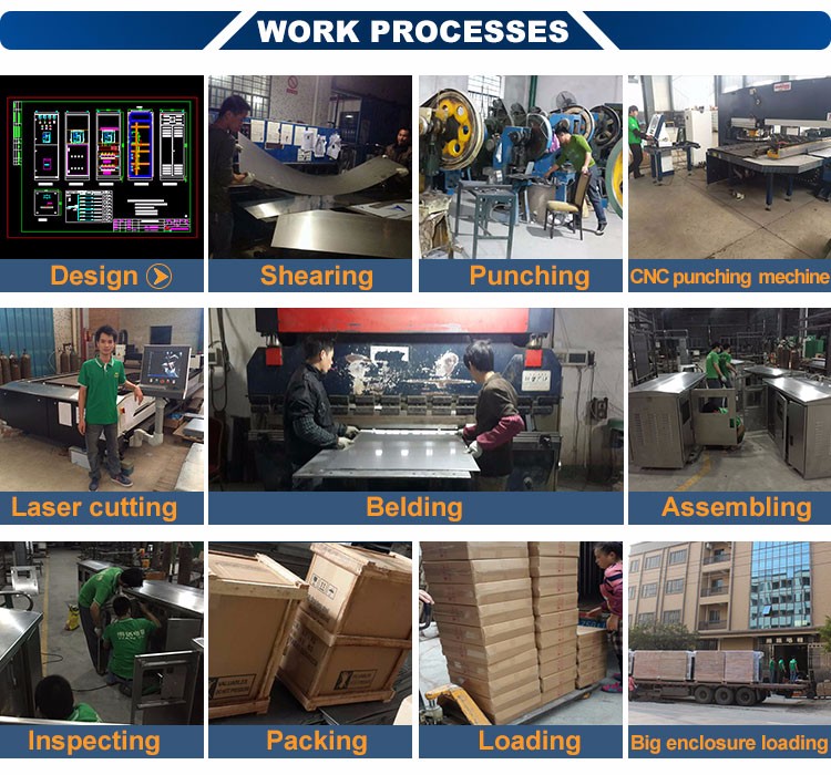 2. Production flow: Plate cutting-CNC stamping-CNC bending-Welding-Powder coating-QC-Assembling-QC-Packing-Delivering