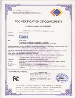 Shenzhen Chafon Technology Co, Ltd mainly take charge of RFID reader and writer device research, production and sales, mainly products include 125KHz, 134.2KHz, 13.56MHz and 860~960MHz frequency, the products conform ISO7816, ISO11784/5, ISO14443, ISO15693, ISO18000-6B/6C etc international standard protocols.