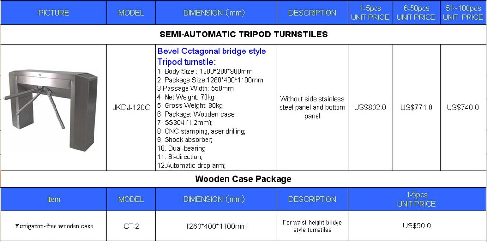 Tripod Turnstile is generally used in simple dissuasion level access control of public passages. It is widely used in work attendance checking systems of factories, consumption systems of public institutions, access control of residential estates, ticket exit systems of scenic, sports and other arenas, handkey management systems of construction sites and so on. The mechanical part of the turnstile contains an emergency control device, which allows free passage in case of power fail. The turnstile has different optional configurations for the applications of all building conditions and for the control of all kinds of passage entrance-exits. Different identification systems (ID card, IC card, bar-code, handkey, fingerprint, iris, etc.) can be configured into the turnstile system. The turnstile can be connected to any kinds of controllers and various consumption devices.