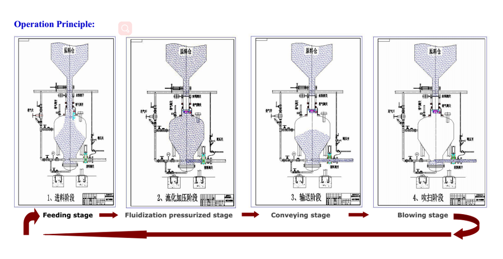 Dense Phase Pneumatic Conveying System uses compressed air or gas as the medium to transfer the bulk materials with pipe from position A to position B. It is helpful to production and environmental protection.