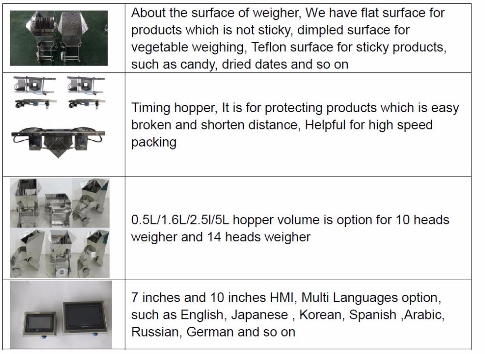 It is suitable for weighing of granule, slice, roll or irregular shape materials such as candy, seed, jelly, fries, coffee granule, peanut, puffy food, biscuit, chocolate, nut, yogurt pet food, frozen foods, etc. It is also suitable for weighing small hardware and plastic component.