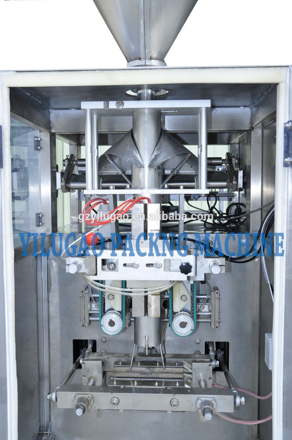 Automatically measuring volume, making bags, filling, sealing, cutting, printing the lot number and cutting easy tearing notch.It can be used to pack all kinds of granules or grain,such as coffee,sugar,salt,seasoning,desiccan powder,etc. It can be equipped with multi-heads weigher, volumetric cup, auger filling head.
