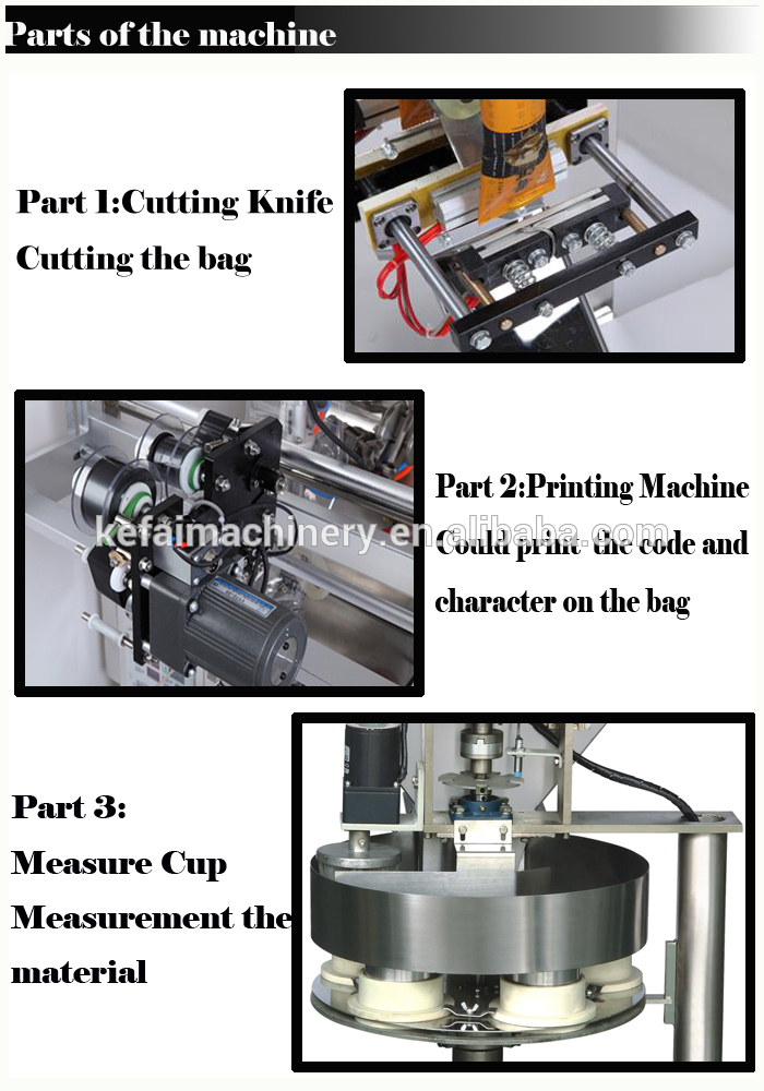 1. This machine can finish : forming bag--measuring--material filling—sealing—counting—date code printing
