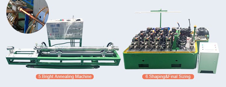 ![]() | 10.1st sizing 2 (for decorative only one section 3~4 units required) 11.Bright Annealing + Anti-twister (optional) 12.2nd sizing (3~4) 13.Turk-Head (1 unit for round, 2~3 units for square) 14.ECT (eddy current tester) 15.OD check (optional) | ![]() |