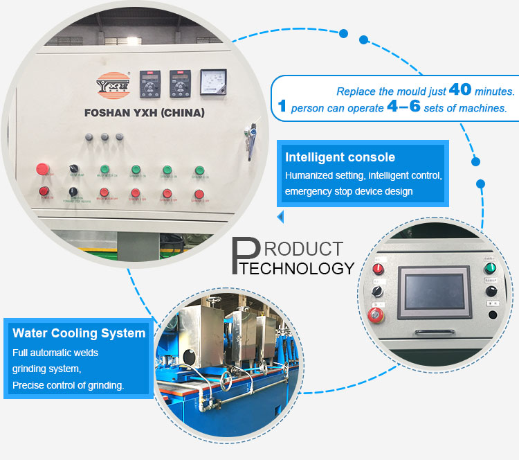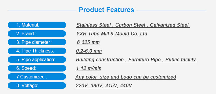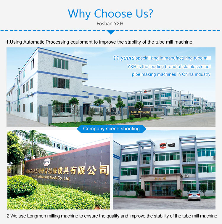 Foshan YXH Tube Mill & Mould Co.,Ltd offer different stainless steel tube mill manufacturing machine, covering range from 6mm to 325mm. (0.24''to12.7''pipe diameter), and thickness is 0.2mm to 6.0mm round pipe, square pipe, rectangle pipe, oval pipe and other irregular pipe as well.