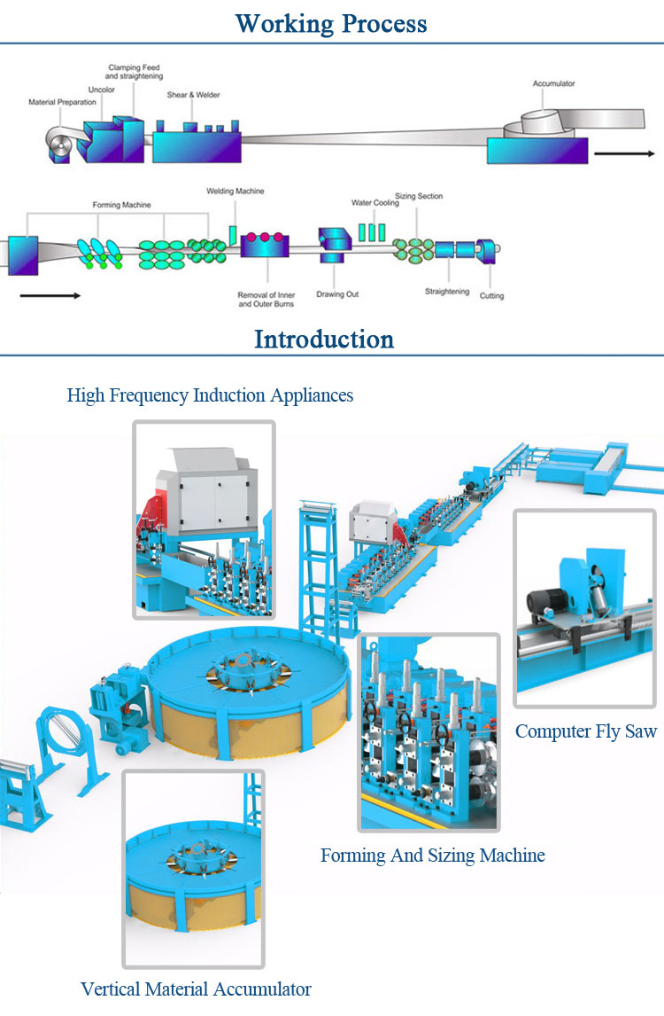 Raw material steel strip→Feeding→Uncoiler→Leveling→Shearing and butt-welding→Cage accumulator→Forming machine→HF welding→De-burr→Water cooling→Sizing→Cutting to length→Roller table→Final inspection→Storage