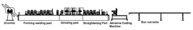 Unfolding strip → Branding → Forming → Welding → Grinding→ Sizing → Strainghtening → Length fixing → Cutting → Unloading.