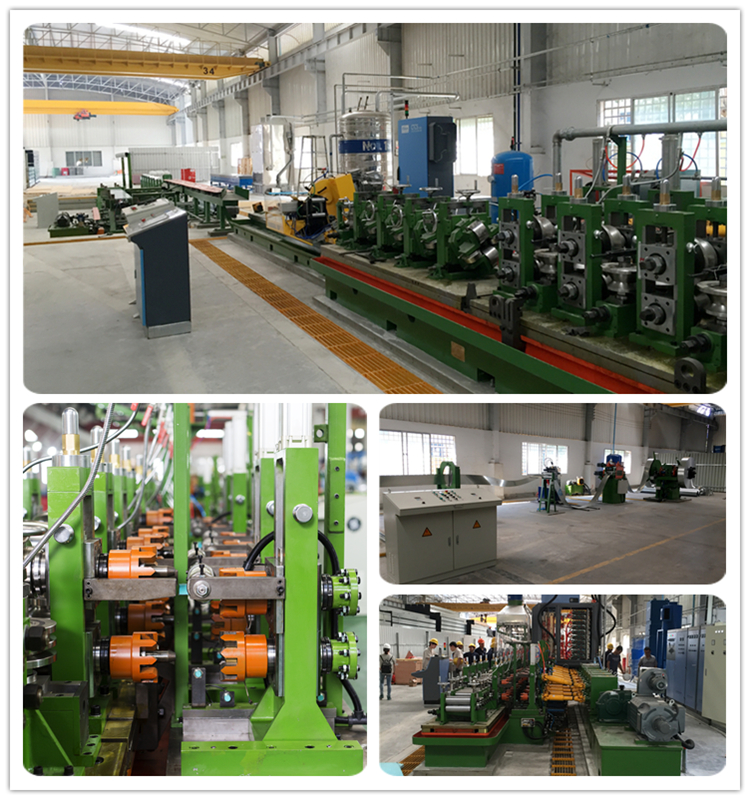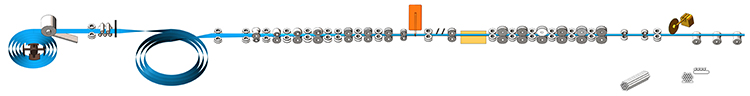 {steel strip} --- un-coiler --- (opener & straightener & pincher & leveler) --- strip-head shearer & butt welder station --- vertical cage accumulator or horizontal spiral accumulator loop --- forming M/C (main driving unit + flattening unit + breakdown section + fin pass section +seam guiding stand + high frequency induction welding system + squeeze welding roller stand + outside scrafing unit + horizontal ironing stand) --- emulsion cooling section --- sizing M/C (main driving unit + sizing section + speed testing unit + straightener + pull-out stand) --- CNC flying saw under computer control --- conveyor table.