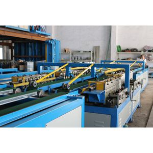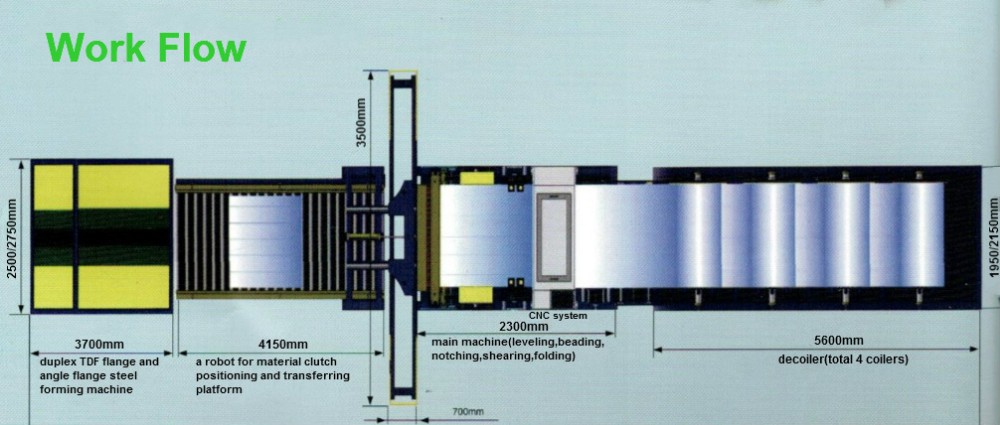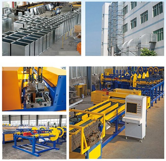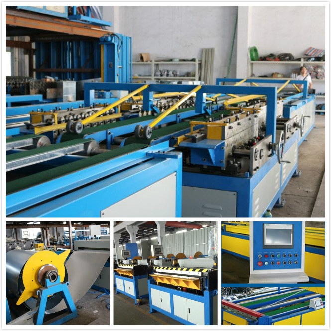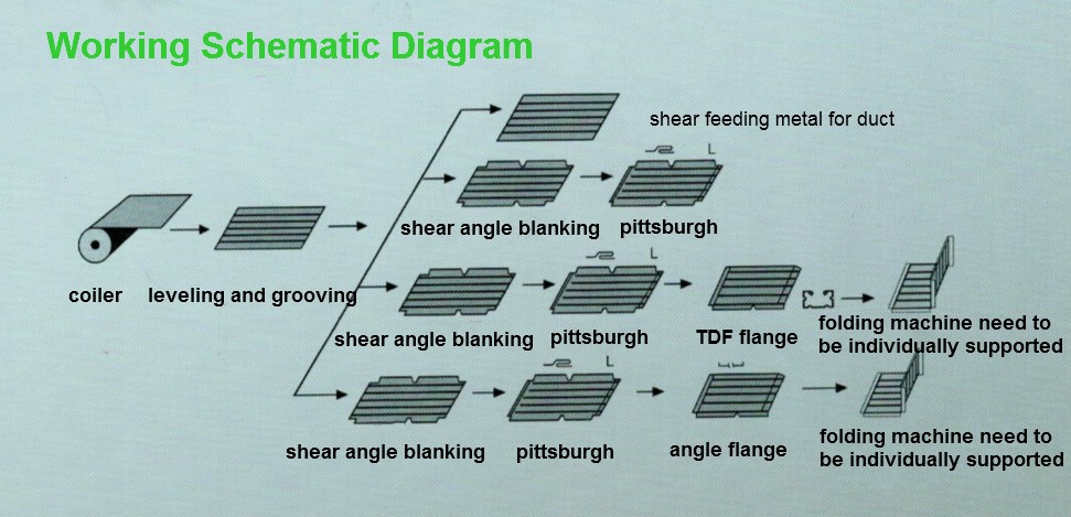 It's mainly for TDF / angle steel / C-shaped flange forming with daily processing capability of 600-2000 square meters. Only with inputting dimensions in duct, production line can automatically complete uncoiling, leveling,beading, punching, shearing, locking, forming TDF / angle steel / C-shaped flange and folding.