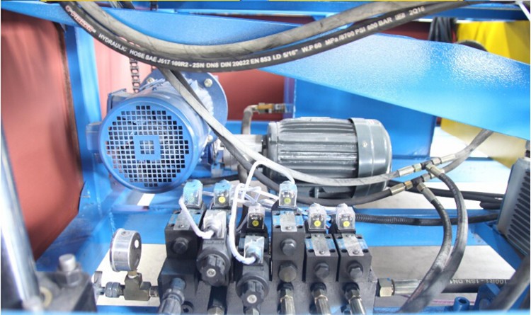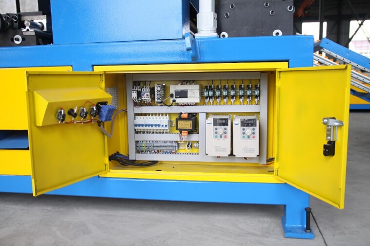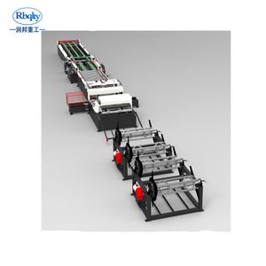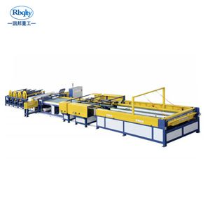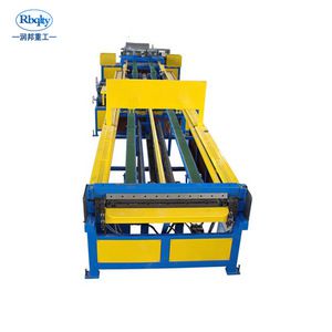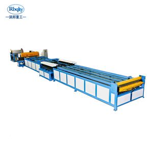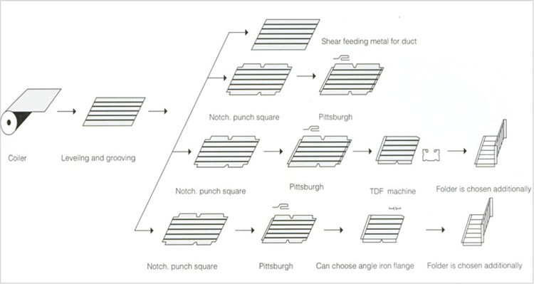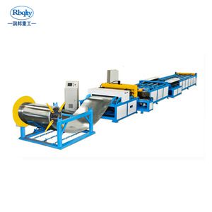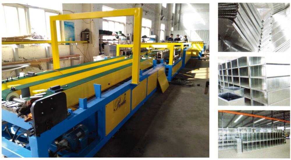 Duct V production line is composed of rack, leveling embossing, hydraulic pointed mouth and square opening, hydraulic shearing machine, joint angle displacement type nip machine, manipulator grabbing assumed a feeding platform, plate double joint flange and double linked list bone molding machine, servo feeding platform, TDF hydraulic crimping machine, electric control part adopts full computer control, bending servo feeding, positioning precision, especially the “ ” word processing line, guarantee the precision of bending. The max feed speed is 16m/min. The length error is ±0.5mm. The line can be used to process TDF flange and angle steel flange duct, with simple and rapid exchange.