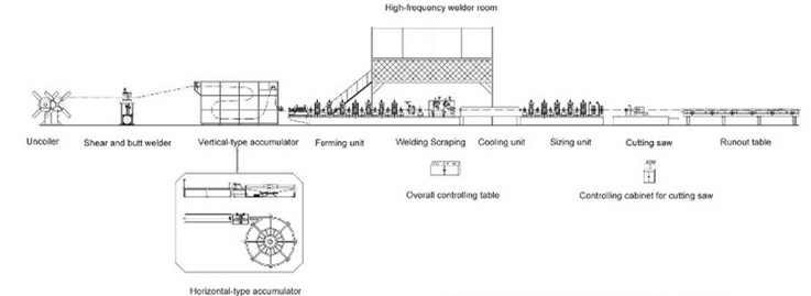 Slit Coil ---- Un-Coiler ---- Shearing And Butter Welder ---- Storage/ Accumulator ---- Forming ---- Welding ---- Cooling ---- Sizing ---- Cutting Saw ---- Run Out Table ---- Finishing ---- Pipe Collecting and Packaging
