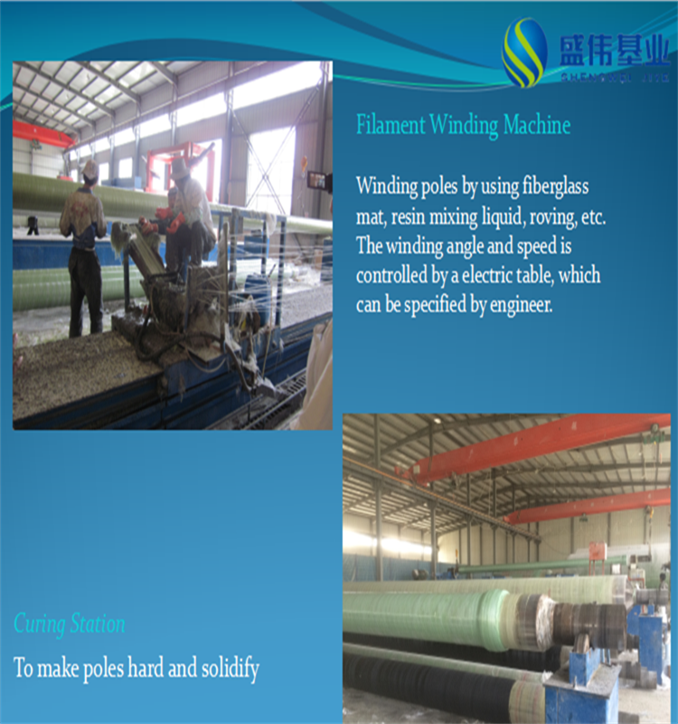 This production line can produce frp lighting pole with diameter 140mm - 320mm, pole length 12m by using raw material of resin, fiberglass roving, reinforcement yarn. It require about 3 staffs to control this line.
