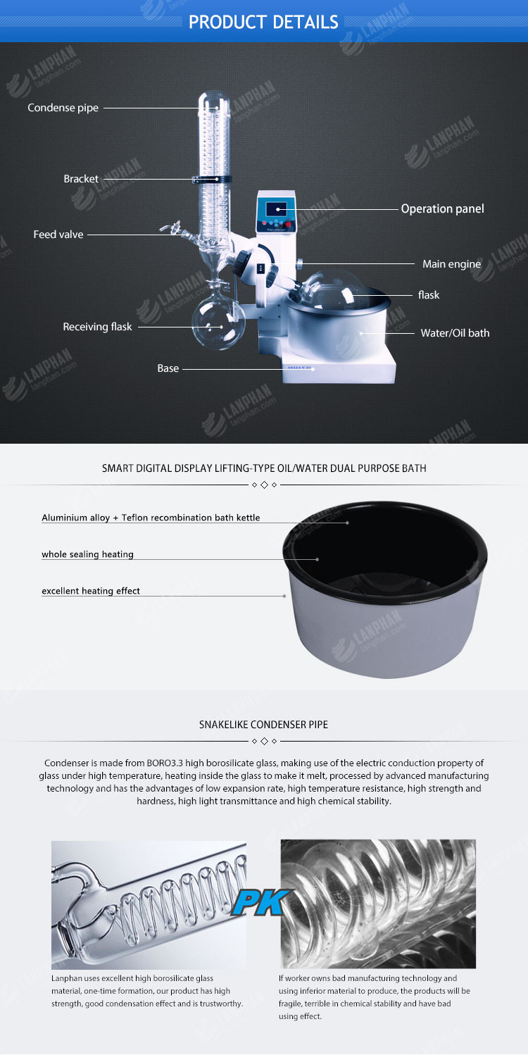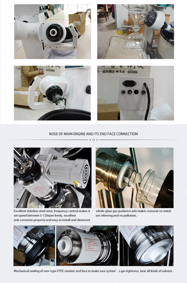 - Newest research rotary evaporator, heating kettle is made from Teflon recombination material, whole sealing heating mode to prevent dry running, applicable of water and oil.