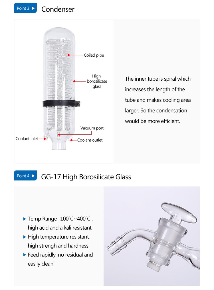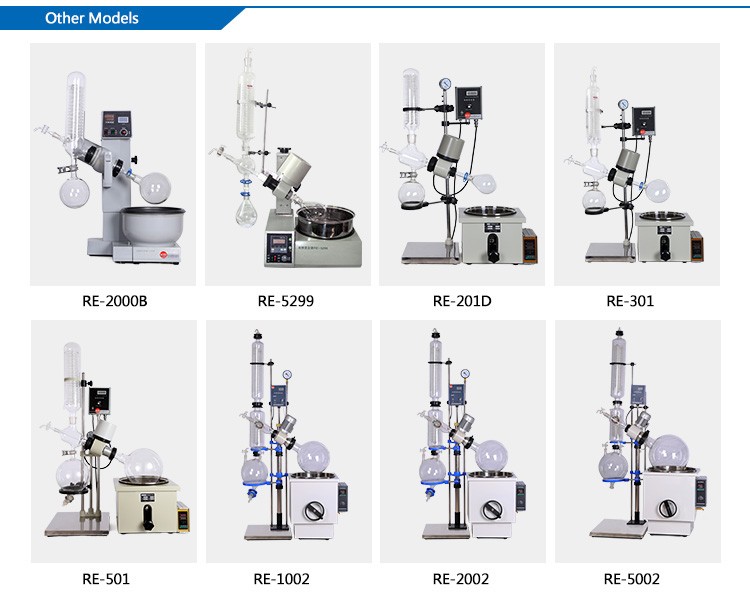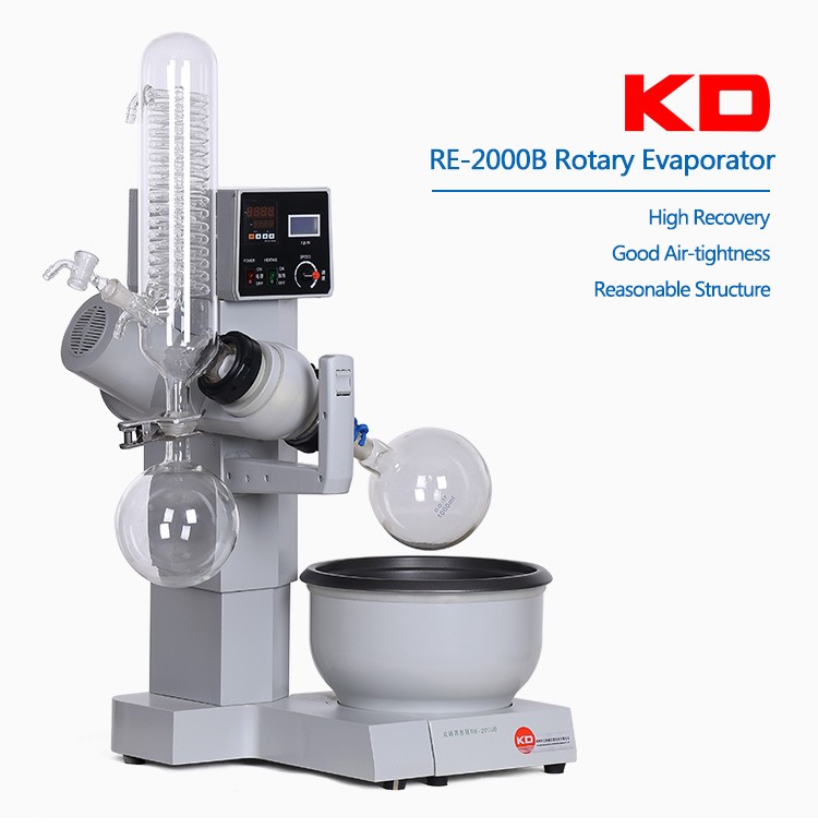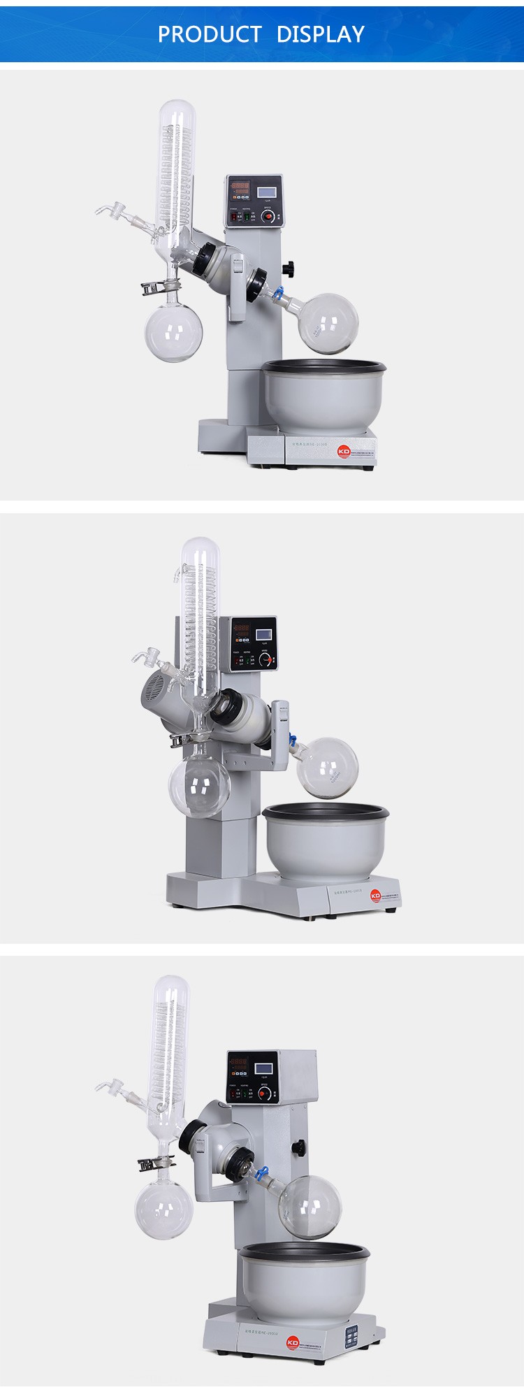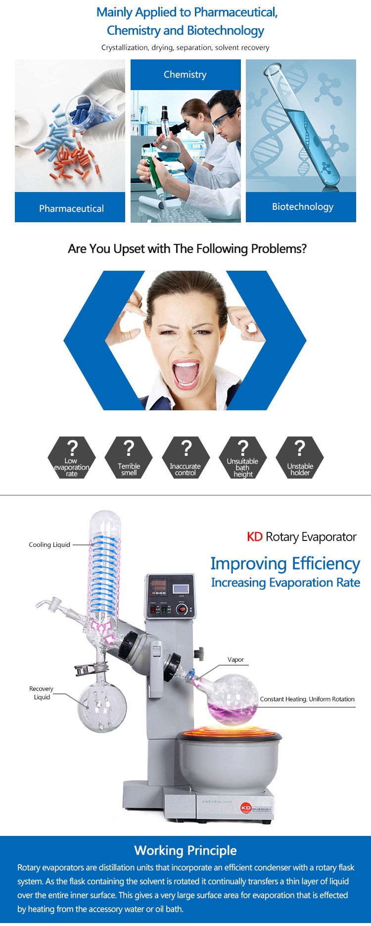 Rotary evaporator is mainly used for enrichment, crystallization, drying, separation, drug, solvent recycling, bio~pharmaceutical industry and others. It under vacuum conditions, through constant heating, rotating at a constant speed rotation of the bottle, large~area thin film formed on the cylinder walls, and high efficiency. Through efficient glass condenser cooling, recycling collection, and dissolved steam, improve the efficiency of evaporation. Intensive purification of biological products, especially suitable for high-temperature decomposition go bad.