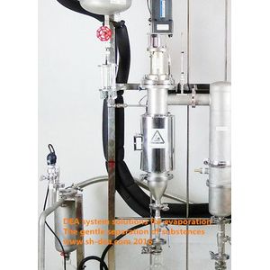 Feed liquid is admitted into still under high vacuum, immediately spread into a very thin film and forced quickly down the evaporation surface. Heated walls and high vacuum drive the more volatile components (distillate) to the external condenser as the less volatile components (residue) continue down the cylinder. The resulting fractions, thus separated, exit through individual discharge outlets. Depending on application, the desired product is either the distillate or the residue fraction. Small amounts of condensable low MW compounds collect in cold trap upstream of vacuum system. For high solvent loads, an optional external condenser may be installed immediately downstream of the still.