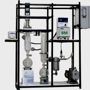Feed liquid is admitted into still under high vacuum, immediately spread into a very thin film and forced quickly down the evaporation surface. Heated walls and high vacuum drive the more volatile components (distillate) to the external condenser as the less volatile components (residue) continue down the cylinder. The resulting fractions, thus separated, exit through individual discharge outlets. Depending on application, the desired product is either the distillate or the residue fraction. Small amounts of condensable low MW compounds collect in cold trap upstream of vacuum system. For high solvent loads, an optional external condenser may be installed immediately downstream of the still.