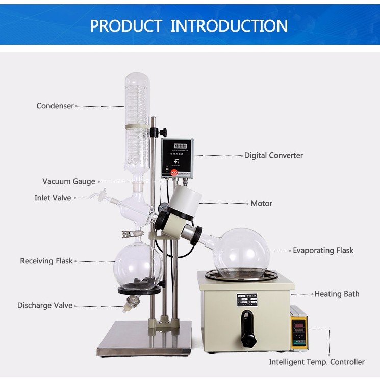 Rotary evaporators are distillation units that incorporate an efficient condenser with a rotary flask system. As the flask containing the solvent is rotated it continually transfers a thin layer of liquid over the entire inner surface. This gives a very large surface area for evaporation that is effected by heating from the accessory water or oil bath.The rotary evaporators are suitable for continuous and discontinuous distillation under normal pressure or in a vacuum, have the advantage of providing careful thermal treatment of temperature-sensitive mediums. It is one of the necessary basic instruments in the chemical industry, pharmaceutical industry, universities and research laboratories and other units etc.