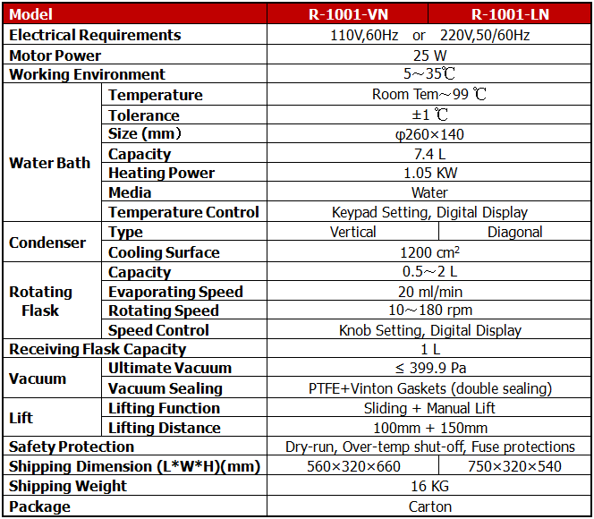 ♦ Easy multi-level manual lift with secure lock for the evaporating flask.