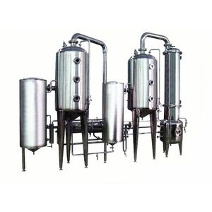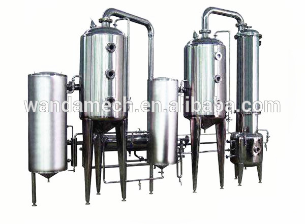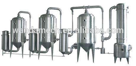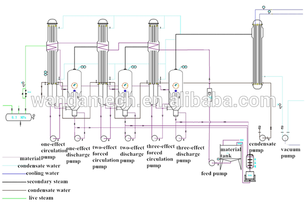 Multiple effect forced circulation evaporator consists of steam header, the heaters, separators , condenser, vacuum system, three effect material liquid pump, condensation water pump, feed pump and operation platform, hand/automatic valves, pipe connection and automatic control system, etc.