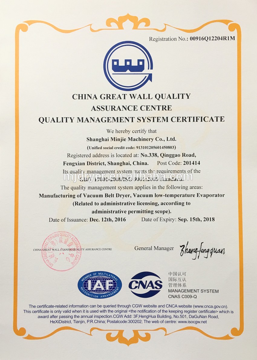 19 years history makes Minjie clearly know”dong moral things, earning conscience money” developping ideas. Client’s need is the target of our efforts and our innovation source. Listenning carefully to the clients, learning humbly advanced foreign technology, working hard to overcome technical difficulties of equipment in pharmaceutical, biology, food, health care, fine chemical and so on industries. Minjie developed equipment and technology win affirmation of domestic and foreign customers. To ensure product quality stability, Minjie has invested over 10 Million RMB on importing advanced equipment: automatic argon arc welder, automatic laser welder, automatic laser cutter, automatic polisher, CNC machine center and so on. Minjie has developed 5 series products with self-owned intellectual property rights, more than 30 models vacuum belt dryer for liquid/paste, vacuum belt dryer for powder/particle, super low temperature evaporator, ambient-temperature sterilizer, etc. Minjie has gained ISO9001 quality management system’s certification.