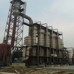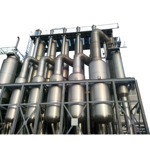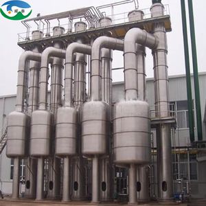 Multi effect falling film evaporator with falling film type evaporation principle will dilute solution of boiling water vaporizing part so as to achieve the pressure of concentrated solutions.The unit adopts continius production process, has the advanges of concentration ration(1/5-1/10), the wide range of viscosities (<400CP), good heat tranfer effect, capacity big, and is suitable for heat sensitive, high concentration, viscosity and corrosities materials evaporation for starch industry corn syrup, malt syrup, food industry juice and taste of semen, the dairy industry milk, suger industry of the juice and the acohol industry, the filtrate ofdistillers' grains concentration.