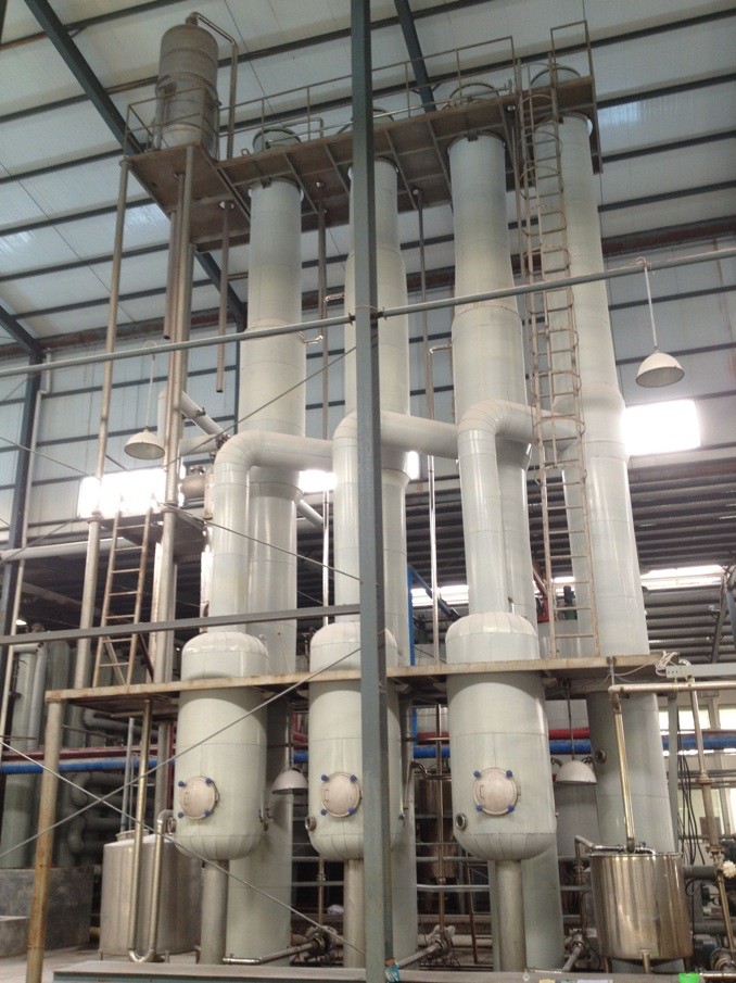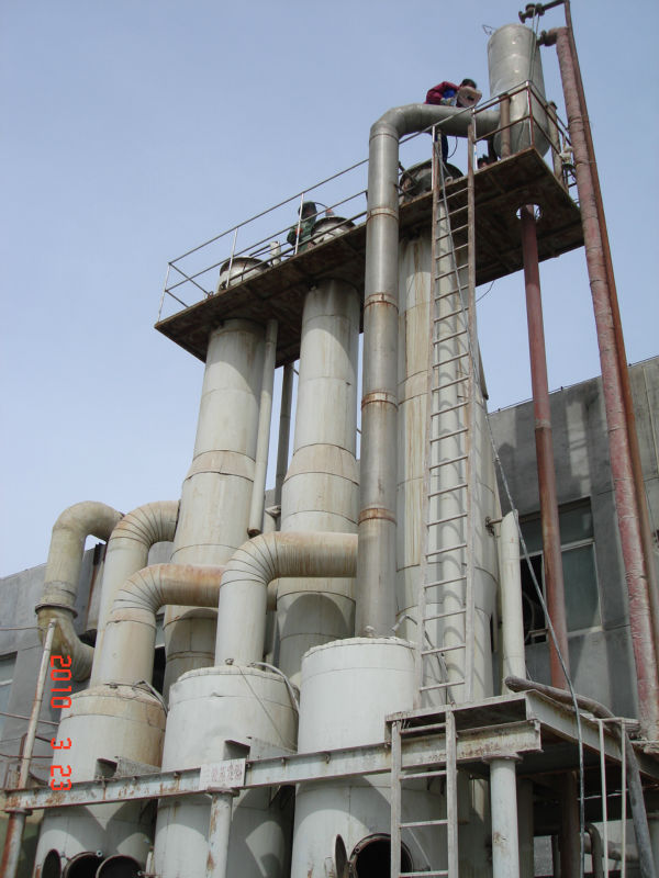 Triple-effect falling film evaporator is composed of Effect I / Effect II / Effect III heaters, Effect I / Effect II / Effect III separators, concentrator, thermal compression pump, vacuum system, material delivery pumps of each effect, condensate discharging pump, operation platform, electrical control system, pipelines and valves and etc.