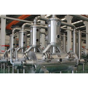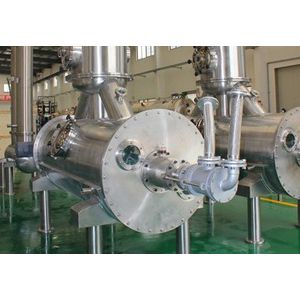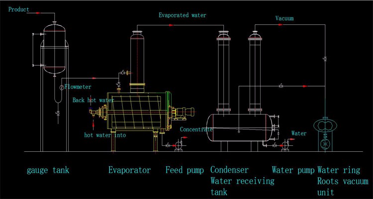 Vacuum low temperature evaporator is new concentrating equipment developed by our company. It realizes low temperature evaporation through high vacuum degree. There is a spinning roller inside the evaporator. Hot water is used to heat the bottom of the evaporator and the spinning roller. Continuous spinning of the roller increases evaporation area and speed, resulting in thin film evaporation. By continuous contact with the surface of the spinning roller, the raw thin material is heated to evaporate. From feed to discharge, the whole concentration process is continuous under vacuum state. Vacuum low temperature evaporator conquers many problems met by traditional evaporator, such as, high concentrating temperature, long concentrating time, denaturation of raw material, easy scale formation during concentration, poor fluidity after concentration and no further concentration. Because of the low evaporation temperature in our equipment, active ingredients of the raw material are kept.