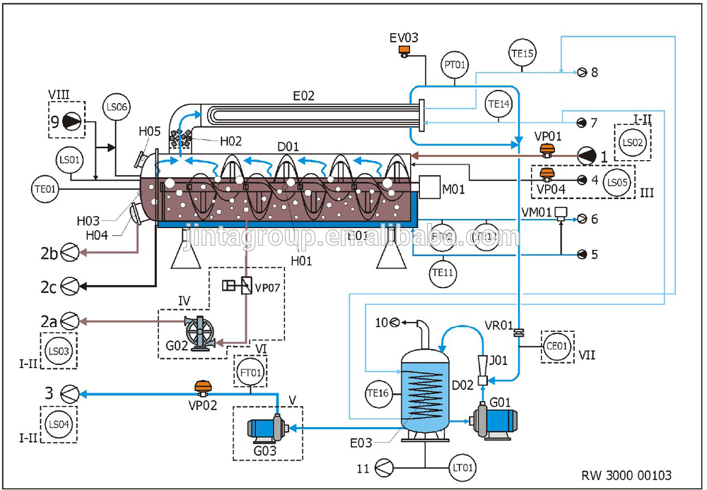 Thermal recovery is realised through the exchangers E03 (if the optional system V is installed) and E02. The liquid to be treated crosses both of them and warms up before entering the boiling chamber. Temperature sensor TE08 measures the temperature of the liquid to be treated entering the boiler after the recovery exchangers.