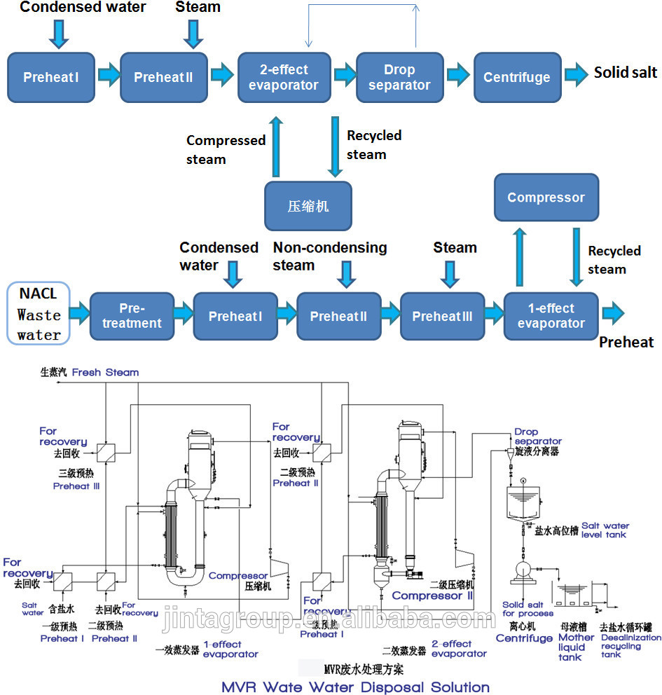 E. Low evaporate temperature. Partial of indirect steam re-inhaled into one-effect heater by jet-type hot press pump can make full use of the heat and evaporate temperature are relatively lower.