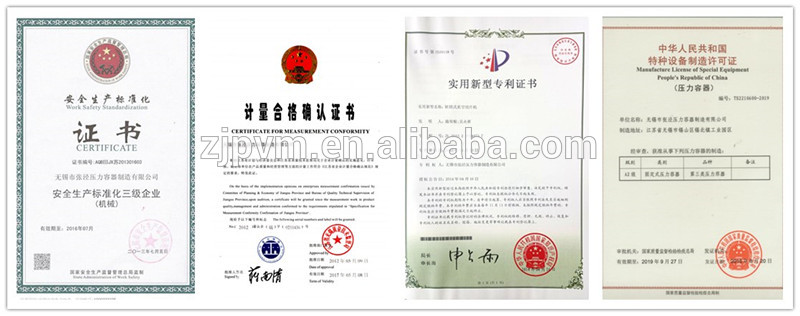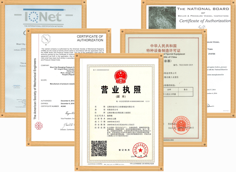 Wuxi City Zhangjing Pressure Vessel Manufacture Co.,Ltd. established in early 1970s',is a manufacturer of high standard pressure vessels and also engineers pressure vessels solution portfolio.We passed the national pressure vessel manufacture lisence since 1993.The company has the ISO9001:2008 quality management system certification and quality certificate of the International Certification Network(IQNet) since 1999.We hold Manufacture License for Category Ⅰ,Ⅱ&Ⅲ (Class A2) pressure vessel and ASME "U" Stamp certificate.
